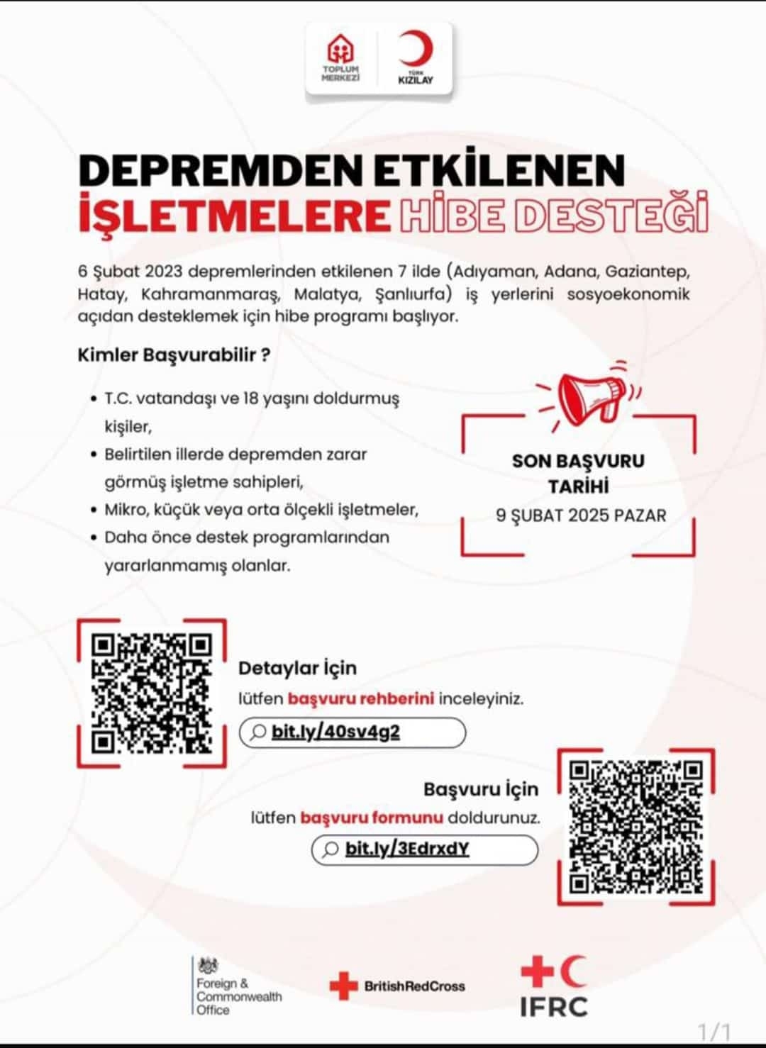 Toplum Merkezi ve Türk Kızılayı Öncülüğünde başlatılan Depremden Etkilenen İşletmelere Hibe Desteği için son başvuru tarihi 9 Şubat Pazar günü olarak belirtildi.